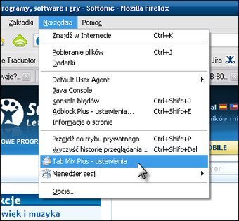 Tab Mix Plus jest na pierwszy rzut oka niewidoczny. Dostęp do jego ustawień mamy za pomocą odpowiedniej opcji w menu Narzędzia. Dodatek pozwala nam w bardzo szczegółowy sposób określić zachowanie kart przeglądarki. Możemy zdecydować jak ma wyglądać pasek kart, kiedy i w którym miejscu ma się otwierać nowa, a także wskrzeszać ostatnio zamknięte strony.